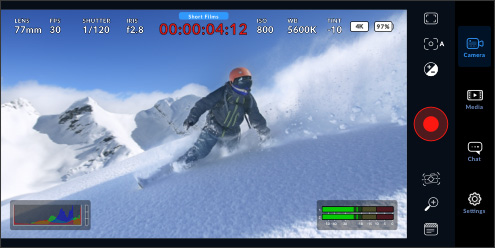 A heads-up display, or HUD, displays the most important camera controls like lens selection, frame rate, shutter angle, timecode, ISO, white balance, gain, and audio levels. Adjusting settings such as exposure can be done by touching the ISO indicator, or changing audio levels can be done by touching the audio meters. You can change any item's settings instantly by tapping it, no need to search through complex menus! Everything is interactive, so if you tap any item, you will be able to instantly make changes.