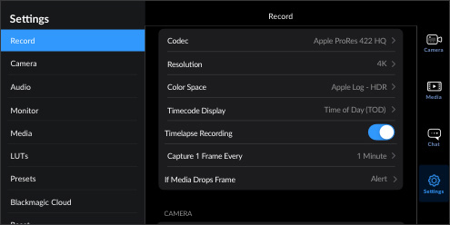 With the settings tab, you can access advanced camera settings such as monitoring, audio, camera setup, recording, and more. You have complete control over video resolution and recording format, including industry standard Apple ProRes as well as space-efficient H.264 and H.265. Additionally, you can adjust the settings for anamorphic de-squeeze and lens correction. Among the audio options for professionals are AAC and PCM formats, as well as VU and PPM audio metering. It is even possible to add external microphones! If you want to recreate a film look, add 3D LUTs!